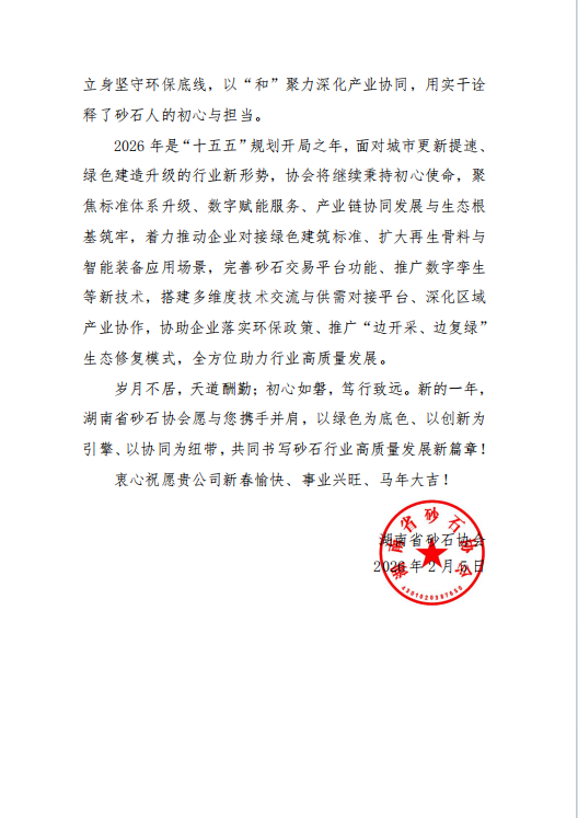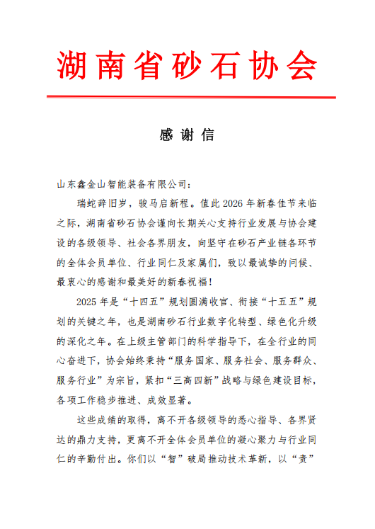 瑞蛇辭舊歲,駿馬啟新程。2026 年新春佳節(jié)來臨之際,山東鑫金山智能裝備有限公司收到湖南省砂石協(xié)會發(fā)來的感謝信,字里行間的認可與期許,讓我們倍感溫暖與鼓舞。