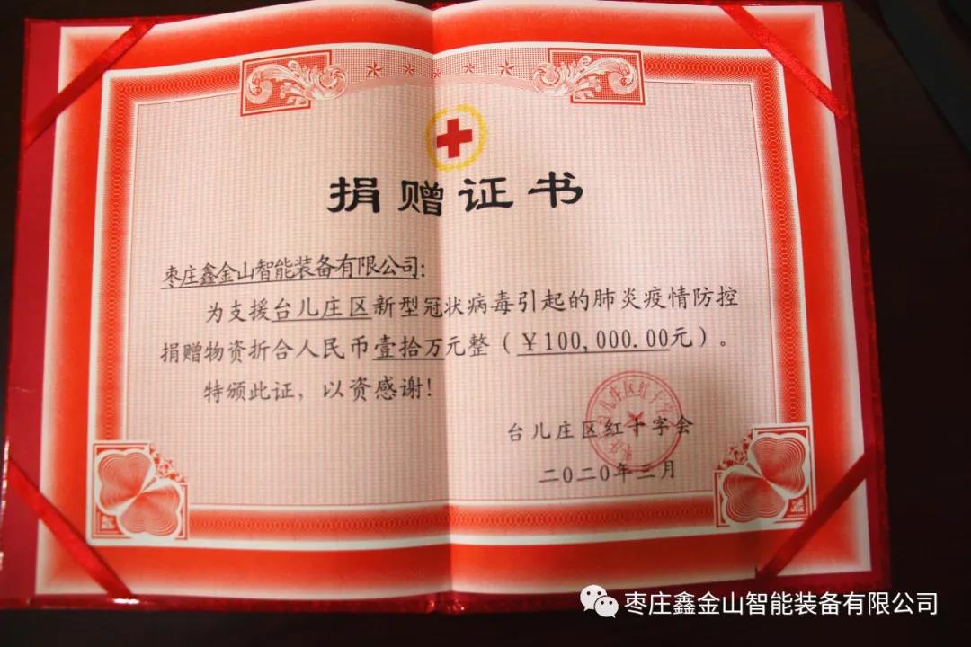 導(dǎo)讀:3月28日上午,棗莊鑫金山智能裝備有限公司向棗莊市臺(tái)兒莊區(qū)紅十字會(huì)捐贈(zèng)價(jià)值10萬元的防疫物資,用于新型冠狀病毒肺炎疫情的防控工作,以實(shí)際行動(dòng)踐行企業(yè)的責(zé)任和擔(dān)當(dāng),為抗擊疫情貢獻(xiàn)一份力量。