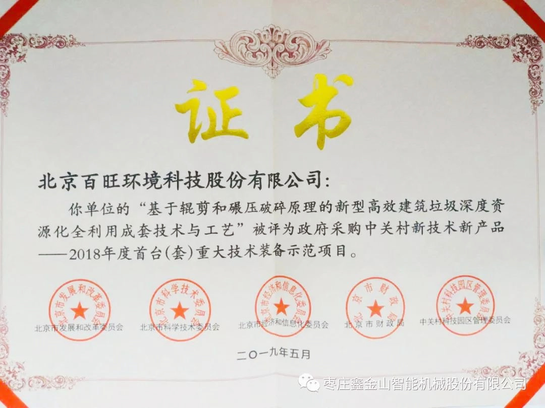 建筑垃圾資源化全利用項目獲得了2018年第七屆中國創(chuàng)新創(chuàng)業(yè)大賽全國總決賽優(yōu)秀獎、2018年中關(guān)村國際前沿技術(shù)大賽節(jié)能環(huán)保領(lǐng)域TOP10項目、2018年中關(guān)村首臺(套)重大技術(shù)裝備示范項目等行業(yè)殊榮。2019年全國大眾創(chuàng)業(yè)萬眾創(chuàng)新活動周主題展示中國再生建材行業(yè)入選項目。
