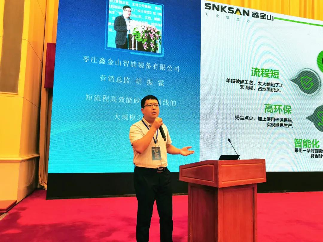 在大會主題報(bào)告上,棗莊鑫金山營銷總監(jiān)胡振霖作了題為《短流程高效能砂石骨料線的大規(guī)模應(yīng)用》的精彩報(bào)告演講。報(bào)告中,系統(tǒng)介紹了鑫金山獨(dú)特的短流程高效能砂石骨料生產(chǎn)線在行業(yè)中的大規(guī)模應(yīng)用。并以綠色礦山中綠色骨料線的“節(jié)能、環(huán)保、智能、集約”四大方面為核心,根據(jù)鑫金山時(shí)產(chǎn)600t—3000t的骨料線具體案例,詳細(xì)展示如何用EPC的方式建設(shè)一條符合綠色礦山要求的短流程高效能砂石骨料生產(chǎn)線。吸引了眾多與會嘉賓的高度關(guān)注。